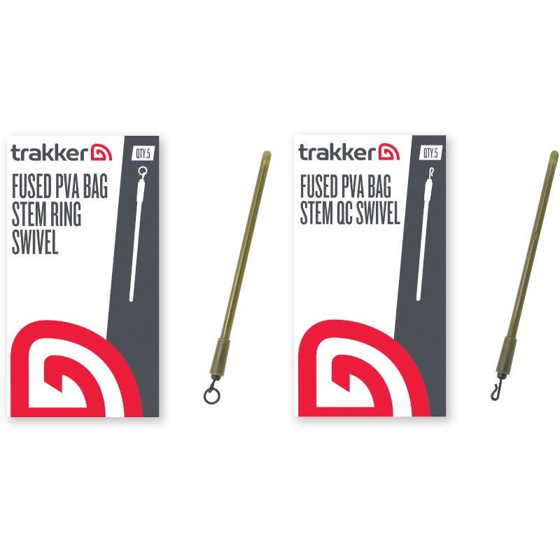 Trakker Fused PVA Bag Stems, available with an integral moulded size 8 ring or quick-change swivel. A super strong and reliable system designed for use with in-line leads. Featuring a dedicated line slot that helps speed up tying up and looping on ready tied bags.